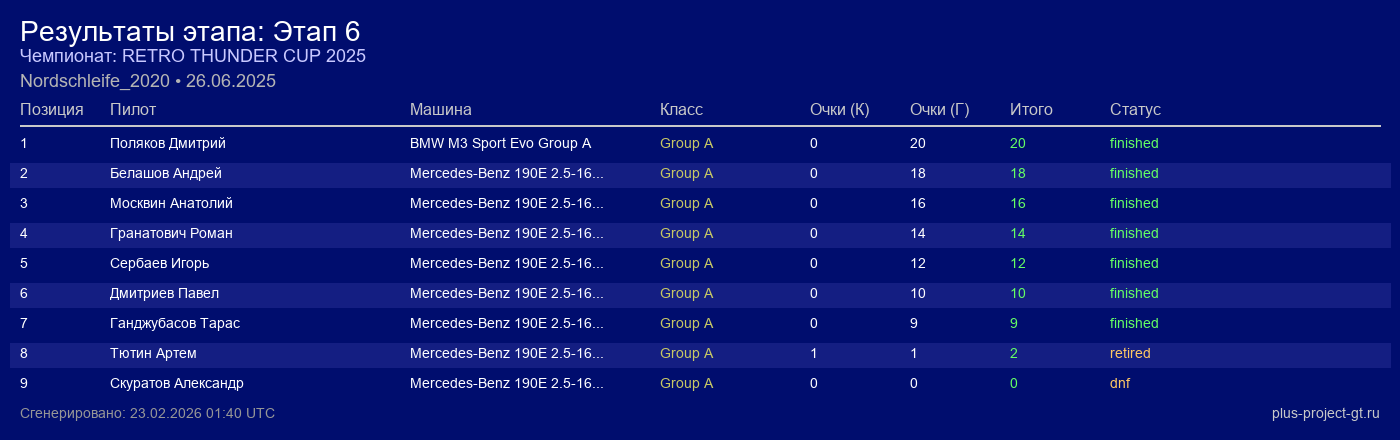 BMW M3 Sport Evo Group A | WSI Thunder Garage | 20 | 6 | 7:22.965 | 44:26.200 | Финиш |