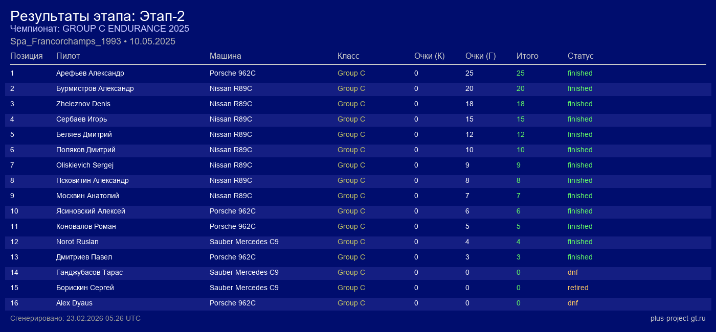 Nissan R89C | Force Feedback | 7 | 40 | 2:05.022 | 91:28.580 | Финиш |