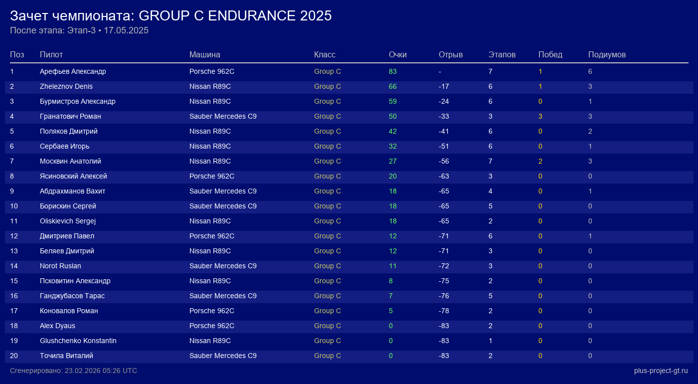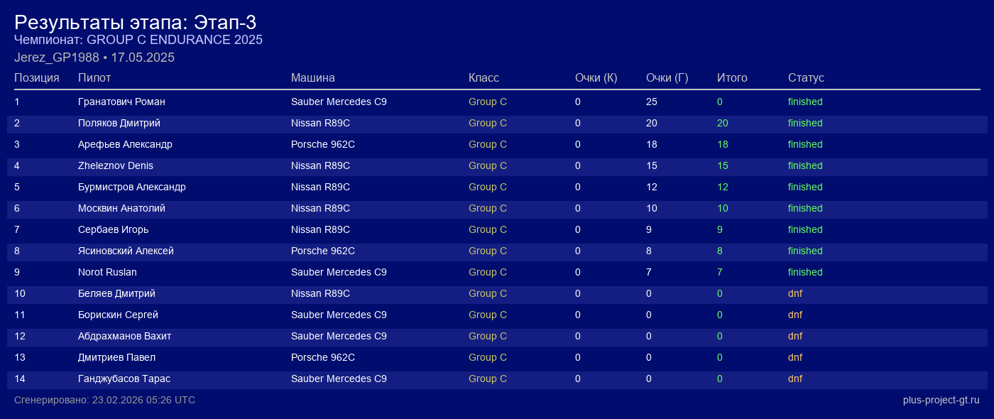 Nissan R89C | Force Feedback | 20 | 57 | 1:34.063 | 91:53.430 | Финиш |