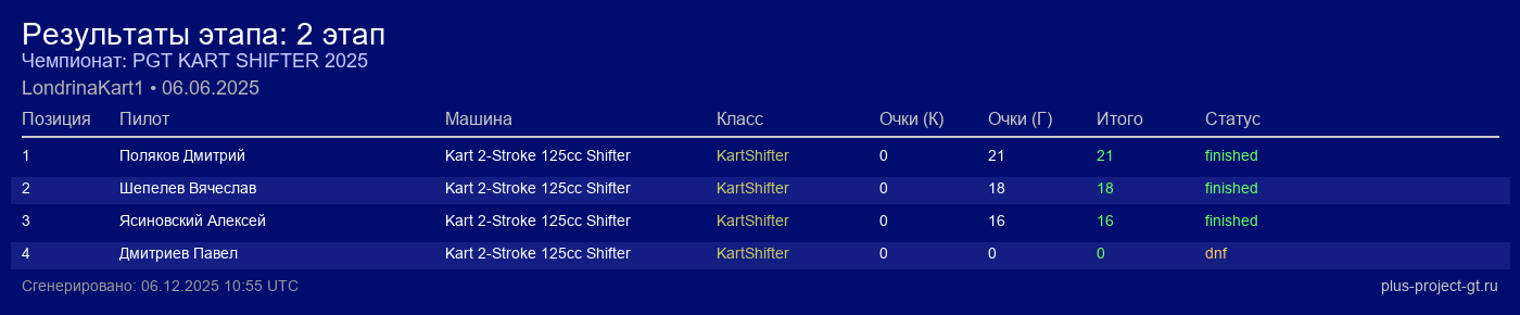 Kart 2-Stroke 125cc Shifter | 16 | 20 | 0:46.634 | 16:15.457 | Финиш | |