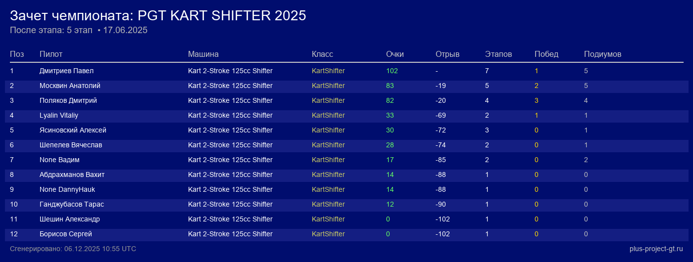 Kart 2-Stroke 125cc Shifter | 12 | 18 | 0:49.778 | 15:47.160 | Финиш | |