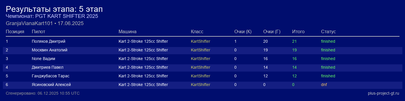 Kart 2-Stroke 125cc Shifter | 16 | 20 | 0:46.930 | 16:28.248 | Финиш | |