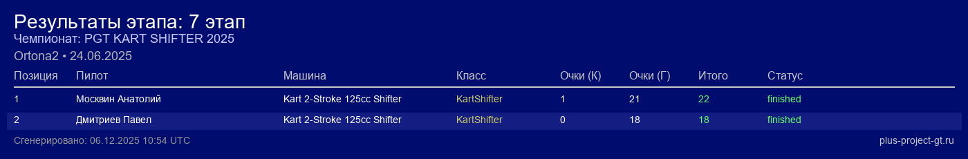 Kart 2-Stroke 125cc Shifter | 18 | 13 | 1:07.716 | 15:39.780 | Финиш |