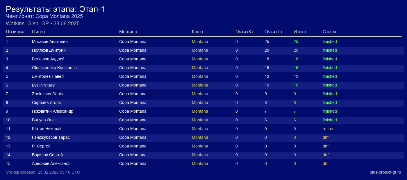 Copa Montana | 25 | 20 | 1:56.025 | 40:58.460 | Финиш | |