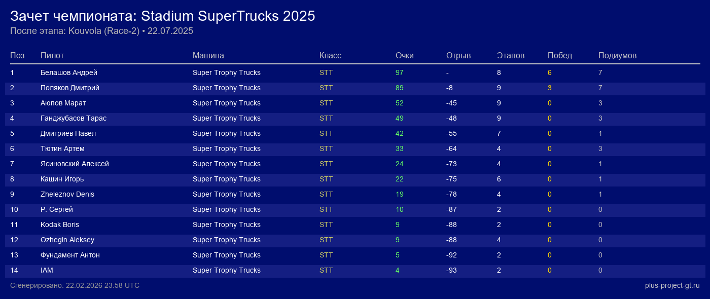 Super Trophy Trucks | 5 | 12 | 1:18.851 | 16:09.025 | Финиш | |