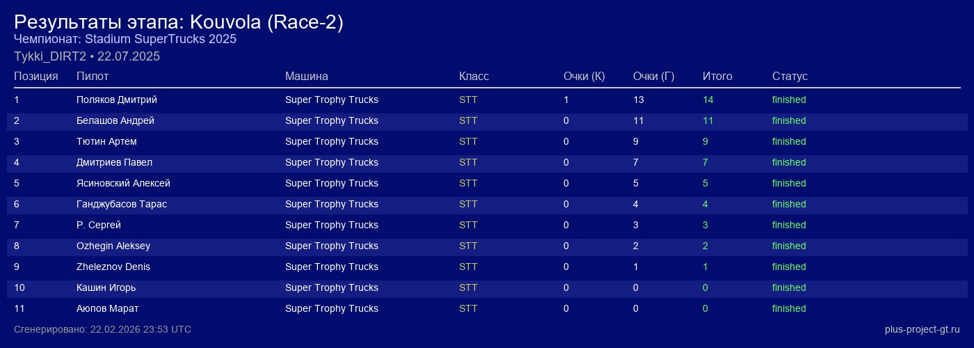 Super Trophy Trucks | 0 | 11 | 1:23.890 | 16:53.500 | Финиш | |