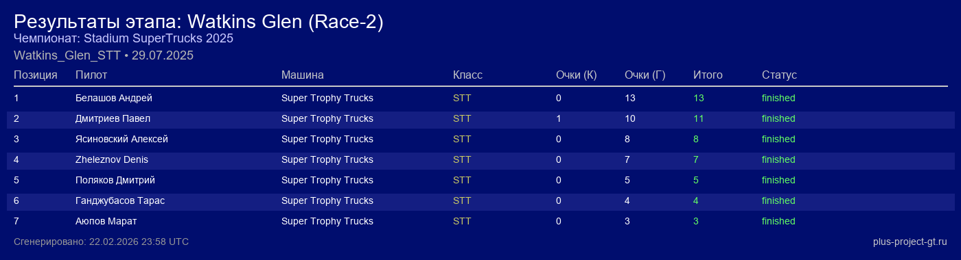 Super Trophy Trucks | 13 | 10 | 1:32.678 | 15:52.614 | Финиш | |