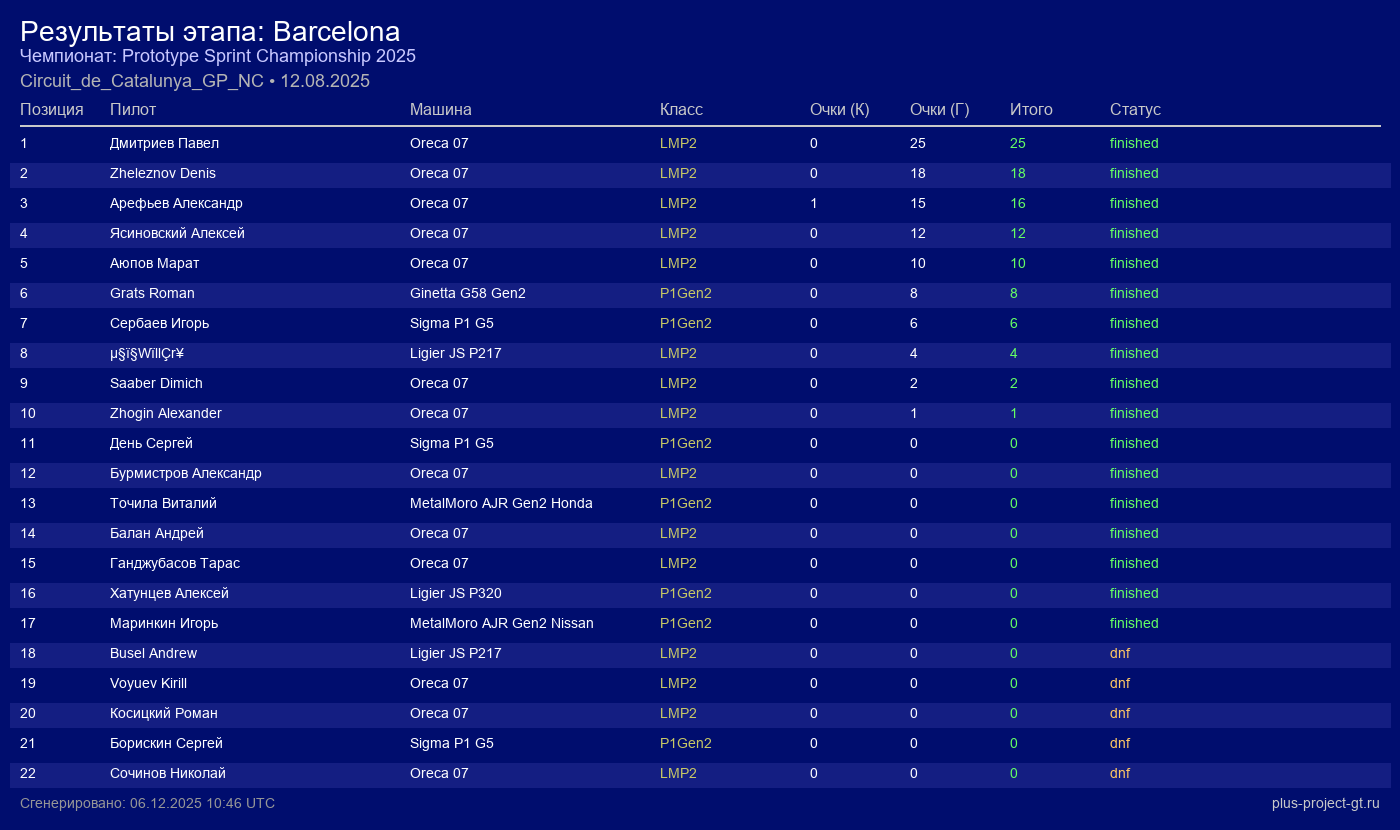 Sigma P1 G5 | 6 | 29 | 1:36.300 | 47:27.650 | Финиш | |
