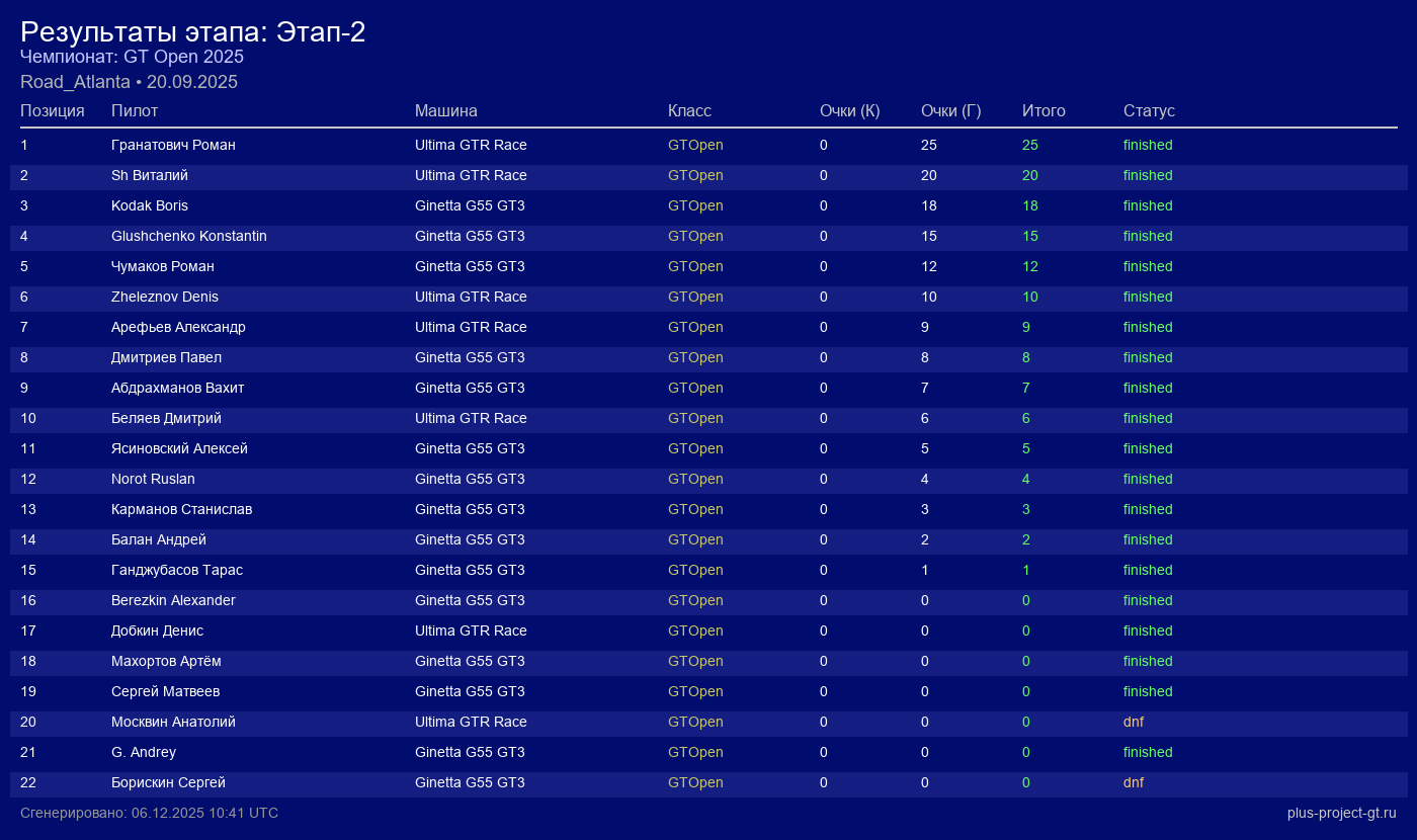 Ginetta G55 GT3 | VR StreetRacers | 2 | 53 | 1:22.202 | 76:27.480 | Финиш |