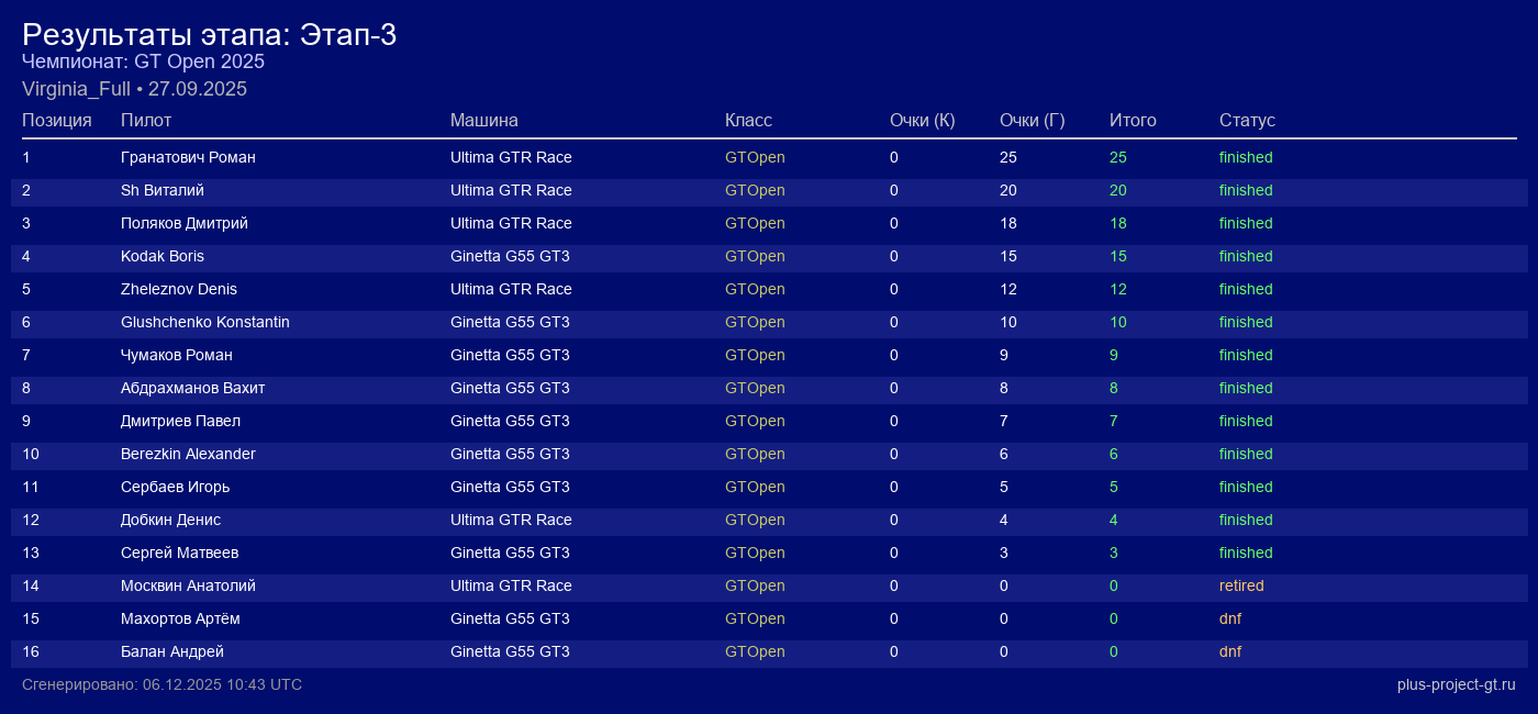 Ginetta G55 GT3 | Racing Games Community | 9 | 43 | 1:46.272 | 78:32.320 | Финиш |